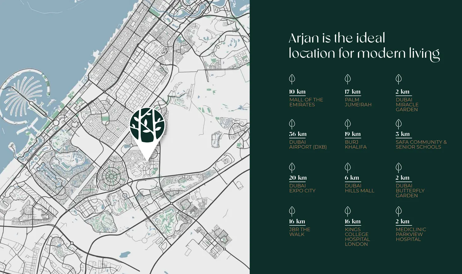 The strategic location in Arjan, Dubailand is known for its prosperity and vibrant atmosphere. Situated at Al Barsha South in Dubai, the project offers easy access to key amenities, ensuring residents enjoy a convenient and well-connected lifestyle. Experience the smooth inter-connection to reach and explore new places every day.